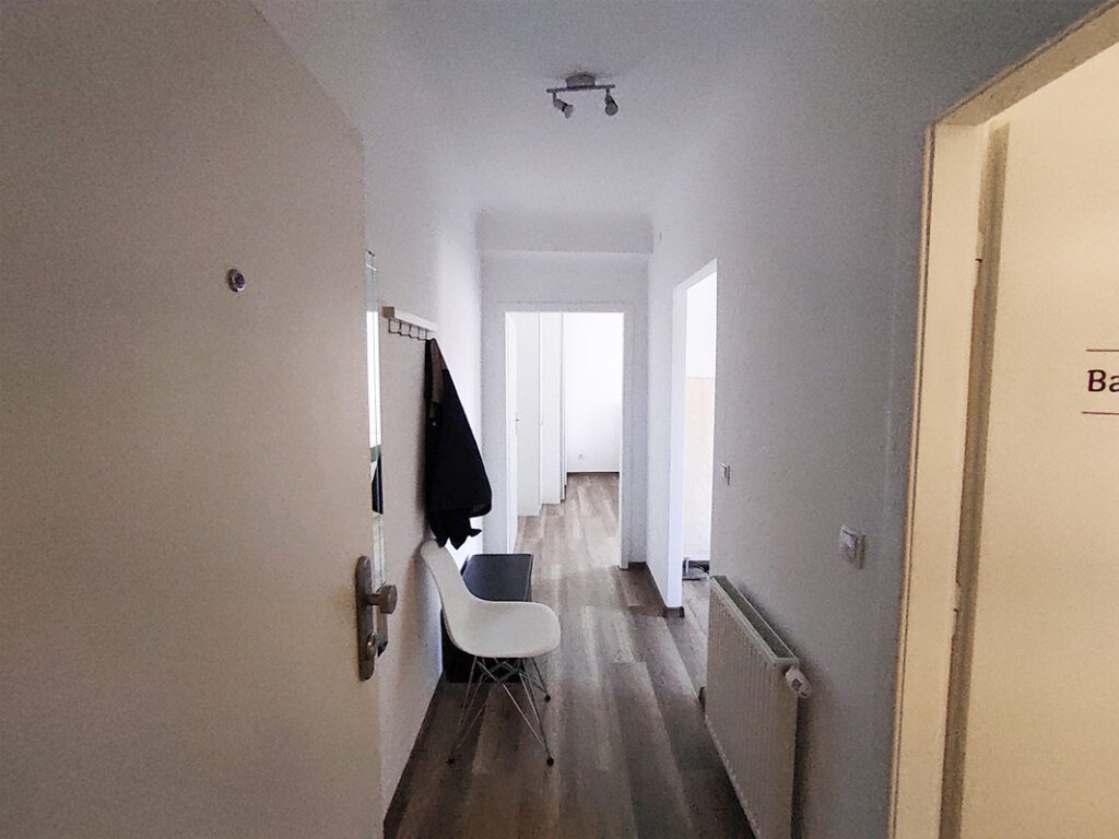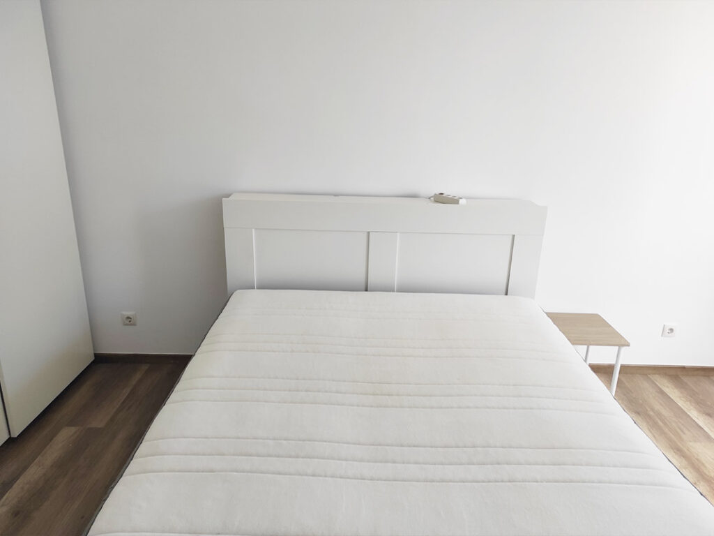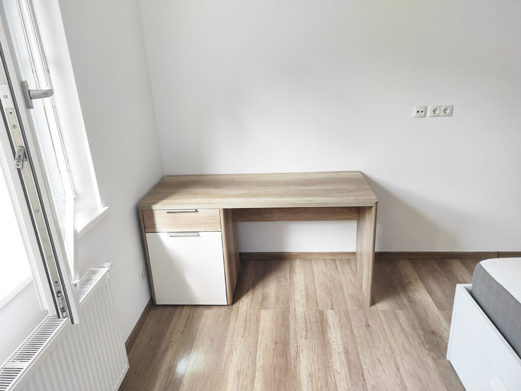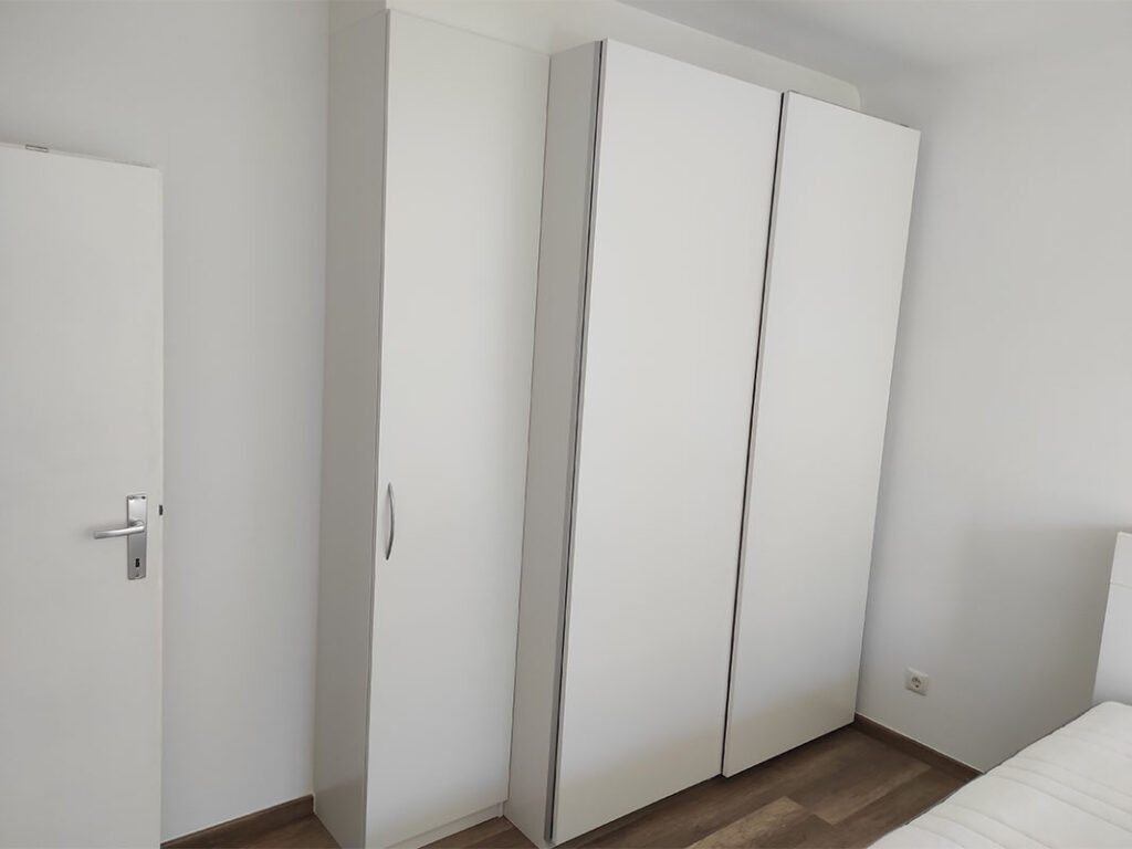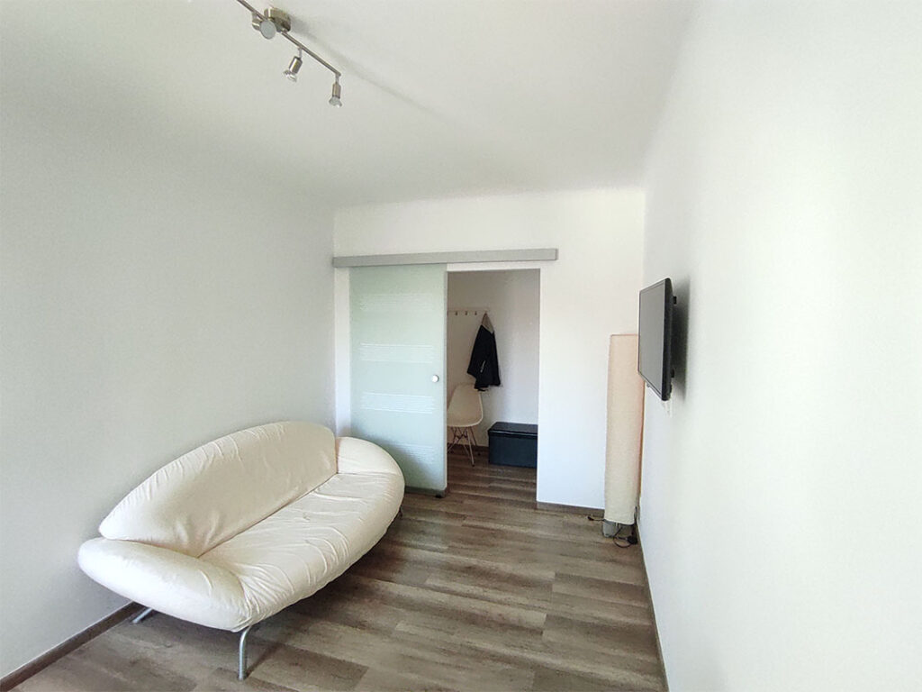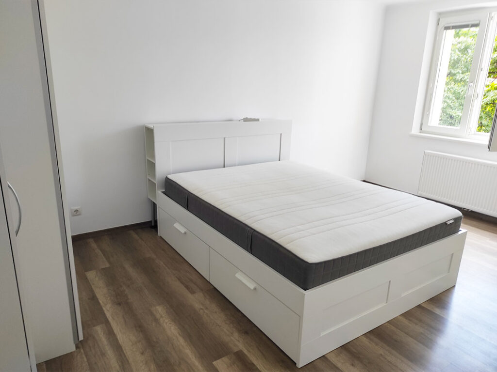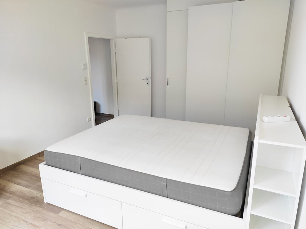 - Schlafzimmer: Doppelbett mit Kopfteil (160cm Breite), Schreibtisch, Maßschrank mit Bügeln
