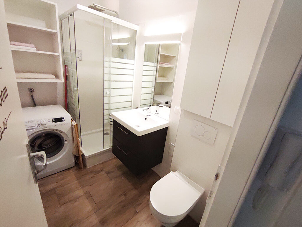 - Badezimmer: Dusche mit Überkopfbrause, WC, Waschbecken, Spiegelschrank, Waschmaschine